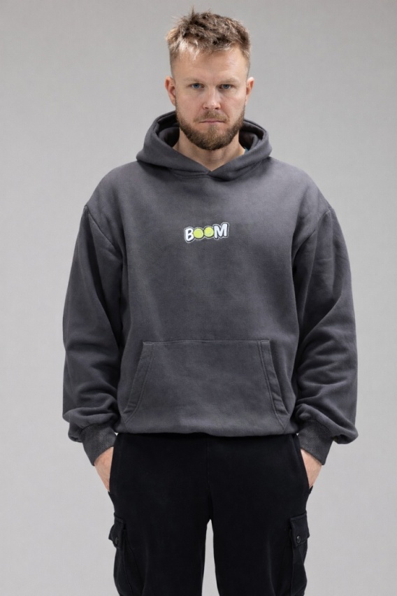 Na przodzie znajduje się haftowane logo BOOM w kontrastowych kolorach biało-czarno-zielonych (ok. 10 × 4 cm) – subtelny, ale charakterystyczny detal podkreślający sportowy charakter marki i nadający bluzie minimalistyczny wygląd.